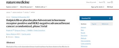 11月4日,国际四大医学期刊之一、英国《自然》旗下《自然医学》(Nature Medicine)在线发表CDK4/6抑制剂达尔西利(SHR6390)联合氟维司群治疗既往内分泌治疗后疾病进展的HR+/HER2-晚期乳腺癌的多中心、随机、双盲III期临床研究(DAWNA-1研究)中期分析结果报告,首次对氟维司群(雌激素受体降解剂)±达尔西利治疗激素受体阳性晚期乳腺癌的有效性和安全性进行了比较。研究结果显示,达尔西利+氟维司群组与安慰剂+氟维司群组相比,无进展生存期(PFS)显著延长。该项研究由中国医学科学院肿瘤医院徐兵河教授担任leading PI,全国39家医院参研,由恒峰g22医药临床研发团队支持完成。