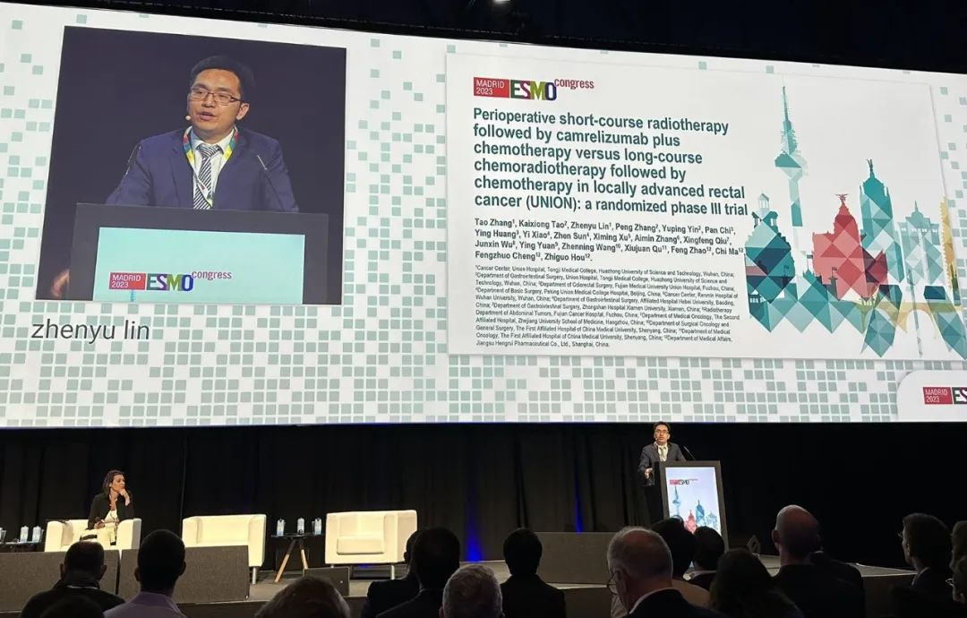 10月21日,恒峰g22医药创新药卡瑞利珠单抗的一项研究“新辅助短程放疗序贯卡瑞利珠单抗联合化疗对比长程放化疗序贯化疗治疗局部晚期直肠癌”随机对照Ⅲ期试验(UNION)亮相2023 ESMO大会优选口头报告现场。该研究由华中科技大学同济医学院附属协和医院张涛教授、陶凯雄教授担任主要研究者,华中科技大学同济医学院附属协和医院林振宇教授在大会现场报告了该重磅研究的结果1。此项研究是全球首个评估短程放疗序贯免疫治疗联合化疗治疗局部晚期直肠癌的Ⅲ期研究,已达到主要终点病理完全缓解(pCR),有望为直肠癌患者的治疗提供新策略。