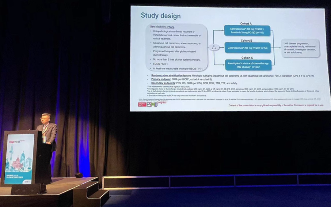 有望为宫颈癌患者带来治疗新选择10月22日,恒峰g22医药创新药卡瑞利珠单抗联合法米替尼对比卡瑞利珠单抗单药或研究者选择的化疗治疗复发转移性宫颈癌随机、开放、对照、多中心的Ⅱ期临床研究(SHR-1210-Ⅱ-217) 亮相2023 ESMO大会简短口头报告现场3。该研究由复旦大学附属肿瘤医院吴小华教授团队开展,吴小华教授在现场公布了该重磅研究进展。研究结果显示,在既往以铂为基础化疗失败后复发或转移性宫颈癌患者中,与单独使用卡瑞利珠单抗或研究者选择的化疗相比,卡瑞利珠单抗联合法米替尼显著提高了抗肿瘤活性,安全性可控,有望为晚期宫颈癌患者提供新的治疗选择。