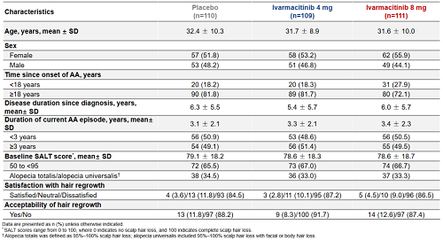 研究共纳入330例重度斑秃患者,硫酸艾玛昔替尼片4 mg/8 mg和安慰剂组基线平均SALT评分分别为78.6、78.6和79.1。