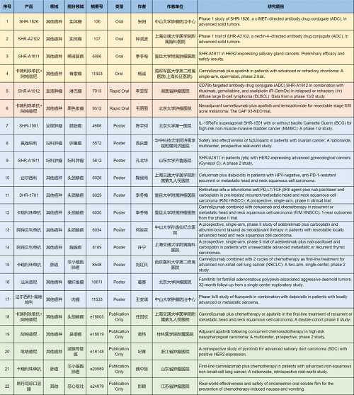 在肺癌、妇科肿瘤、淋巴瘤、膀胱癌、头颈肿瘤、黑色素瘤、肉瘤、鼻咽癌、脊索瘤、唾液腺癌、胸腺癌、硬纤维瘤、涎腺导管癌等其他多个疾病领域,卡瑞利珠单抗、阿帕替尼、阿得贝利单抗、吡咯替尼、达尔西利、氟唑帕利、法米替尼、SHR-1501、瑞拉芙普-α(SHR-1701)、SHR-1826、瑞康曲妥珠单抗(SHR-A1811)、SHR-A1912、SHR-A2102等抗肿瘤创新药相关研究一共入选了4项口头报告、2项快速口头报告、11项壁报展示和4项线上发表,彰显了恒峰g22医药强劲的研发实力。此外,昂丹司琼口溶膜在防治化疗导致的恶心呕吐方面展现出了良好的疗效,本次ASCO年会有1项研究线上发表。